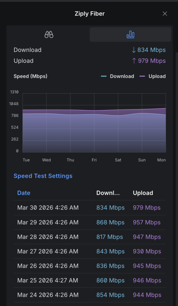 By the time I had moved to Marysville the POTS and fiber provider had gone through several changes; Verizon to Frontier to Ziply. Ziply is by far the best of this evolution. It seems they’ve not only invested in core network upgrades but also the neighborhood nodes. Latency has always been <5ms and recently went down to <3ms. Currently I’m on the 1gig plan and you’ll see from the screenshot below that I get as close as you can get to advertised speed on upload, download is pretty good. My guess is that since I’ve always got some download running that it makes the speedtest get a lower result.